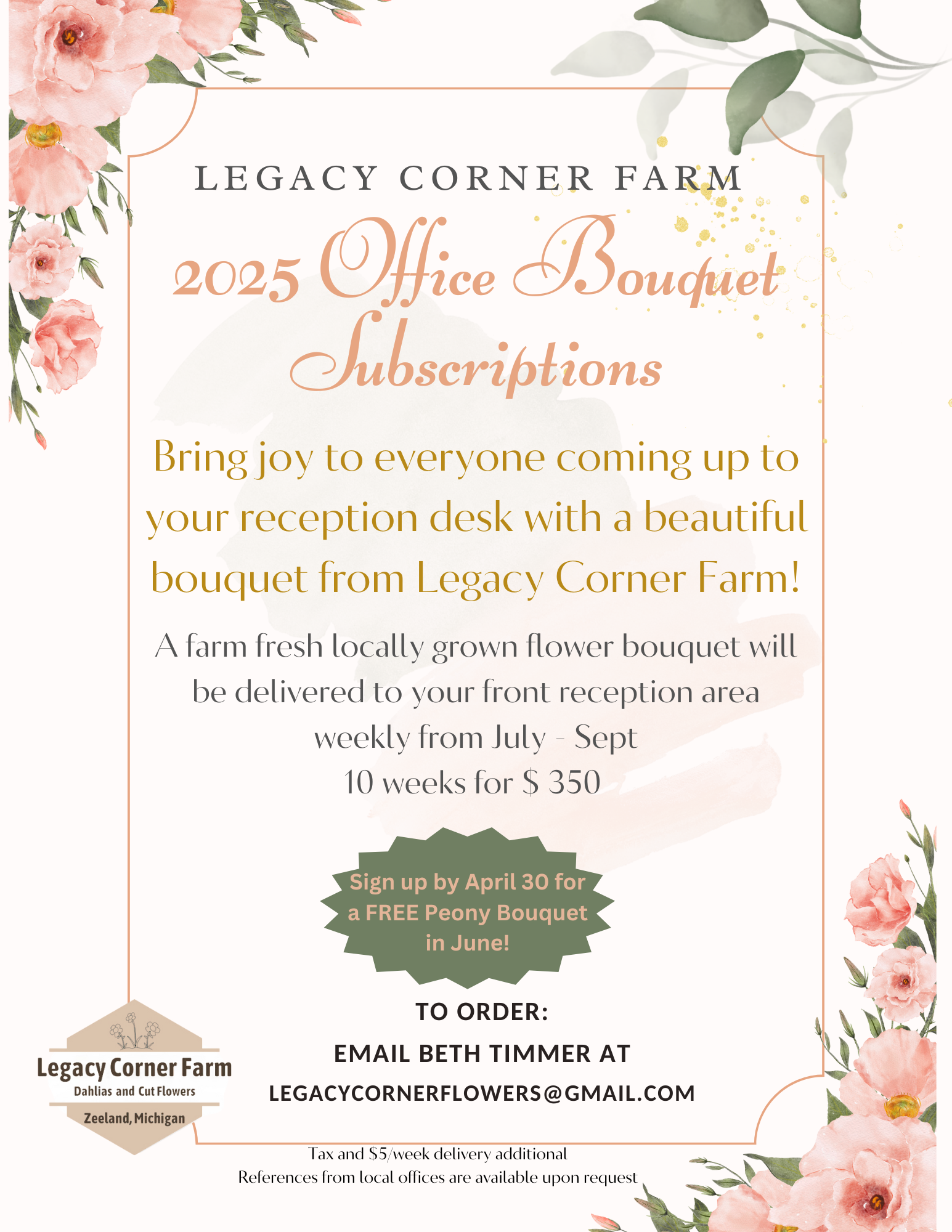BONUS: Sign up by April 30th and receive a FREE Peony bouquet in June!